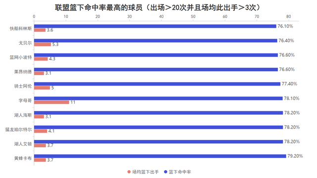 在篮下、非篮下三秒区与中距离莱昂纳德分别有着76.6%、53.6%与46.8%的命中率,三分线外虽然不算顶级但37.9%的命中率也接近40%的优秀水准,而他三分线内的命中率更是联盟至少出场20次球员中的顶级水准:
