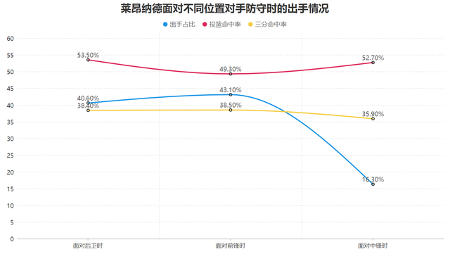 在面对对手的换防时,他仅在面对中锋防守时的三分命中率有一定的下降,但这也在情理之中毕竟面对大个子的强投很难不受干扰,因此莱昂纳德面对中锋时的三分出手也是占比最低的,而除此之外无论是面对前锋、后卫还是中锋的防守他均有50%左右的投篮命中率,超大的进攻范围+抵抗防守的干扰就是莱昂纳德打出超强进攻表现的关键。